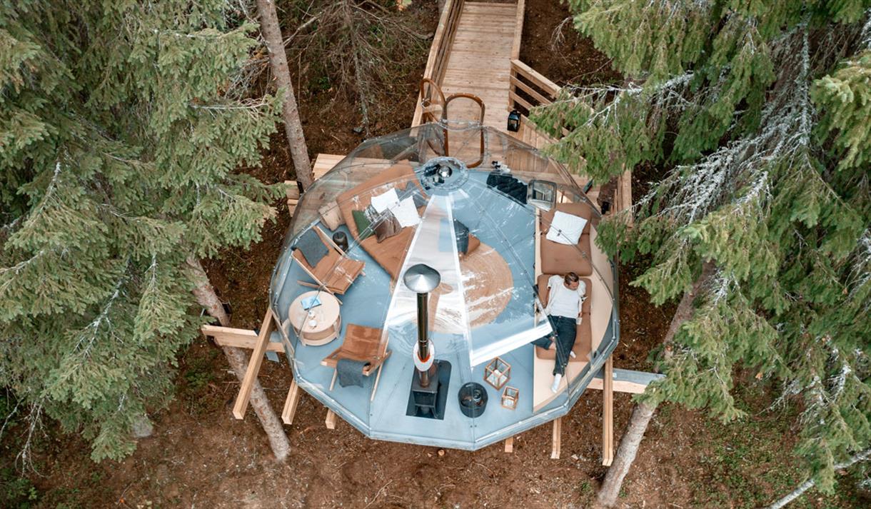 The treetop igloo in beautiful Lårdal, Telemark, is secluded, high up in a forest clearing at the top of the valley. Here you float and live high while your soul finds peace, surrounded by steep, proud hills and resting water that is reminiscent of Western Norway's dramatic scenery.