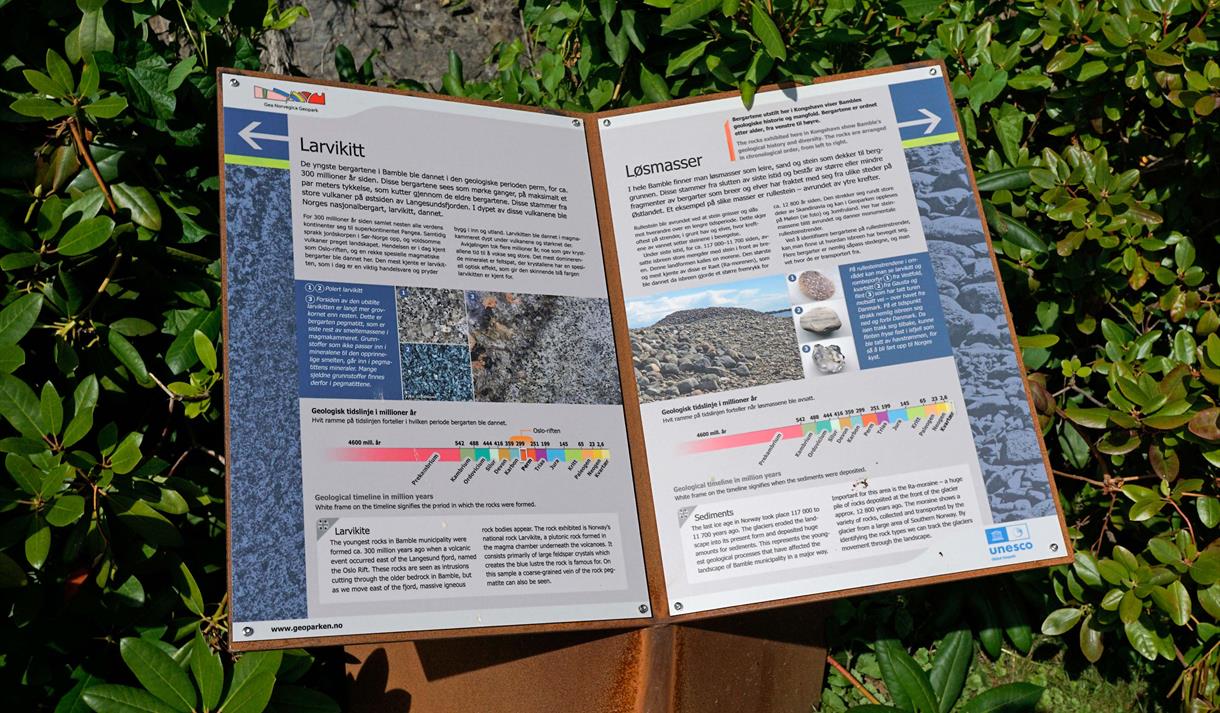 The municipality of Bamble has a long and exciting geological prehistory - a full 1,500 million years long! There are traces of many different events in the bedrock here, from the bedrock in the south and west, which was once part of mighty mountain ranges, via tropical sea areas to volcanoes and ice ages. In Kongshavn, between the center of Langesund and Fjordline ferry rental, this long story is told along a timeline. The boulders are examples of the geology in the Bamble area, and on the signs you can read more about the long journey that the area has been on.
