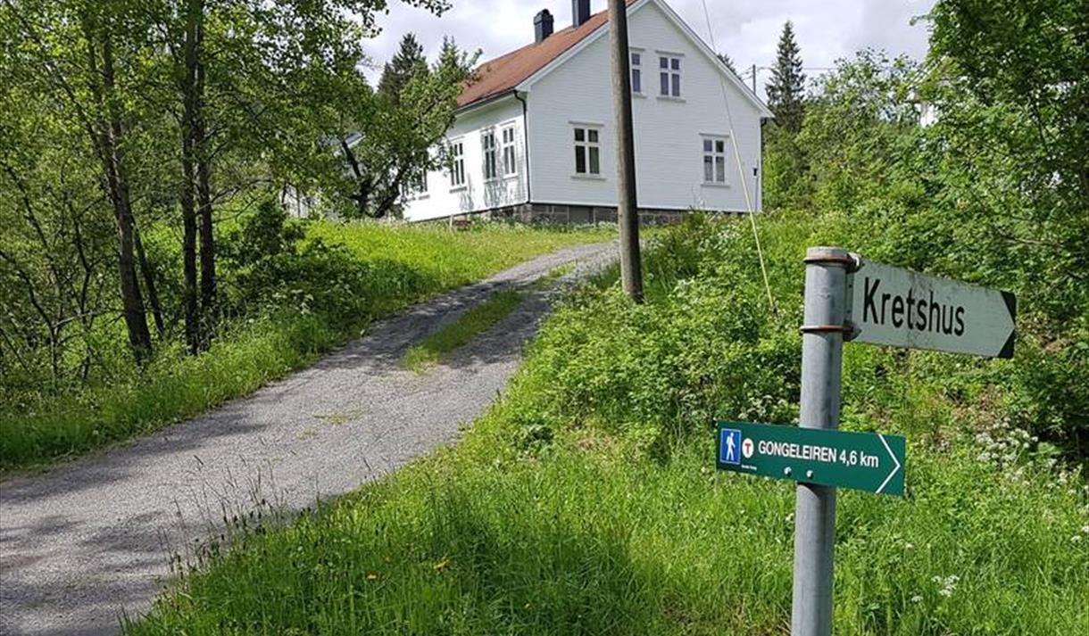 The tour starts at "Grendehuset" on Dørdal, where it is possible to park for some cars. After about 100 m on Old South Main Road, turn left onto a farm road under E18 (until December 2019) and continue on Gongeveien. It passes under the new E18 and continues past Fostvedt Farm, from where it is a toll road. Follow the old fine sign and the more modern green to the left towards Gongeleiren. Then it will be about a km on the old tractor road and trail until you reach the dirt road again. Follow this north until you see the sign for the right sign for Gongeleiren. (It is also possible to turn off to the right earlier to get "back to the camp" via the lookout post.).