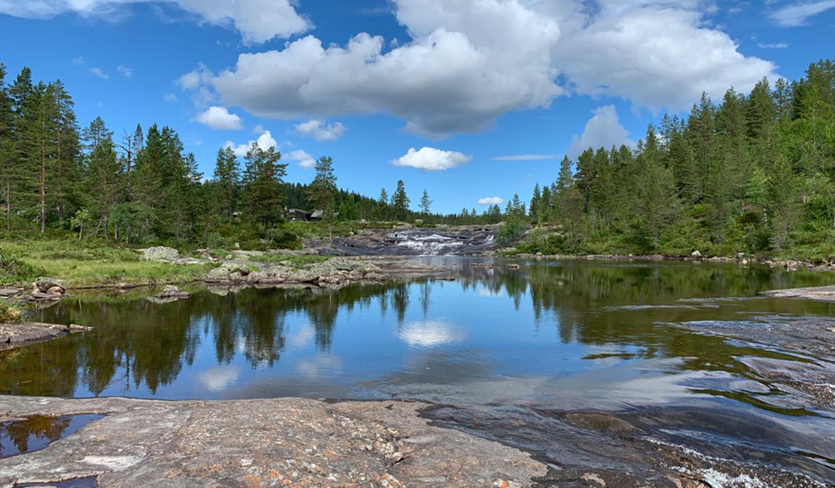 Ufsbu is located by Ufstjønn at the top of Langfoss, and both the location and the cabin itself are experiences to behold. The cabin includes a kitchen, a living room, three single beds in the main room, and a bedroom with a bunk bed and a sofa bed, providing a total of six sleeping places. Ufsbu is of basic standard with an outhouse. The refrigerator and stove are gas-powered. Water is fetched from the creek, and the cabin has a solar power system that provides electricity for some indoor lamps and 12V charging for mobile phones.