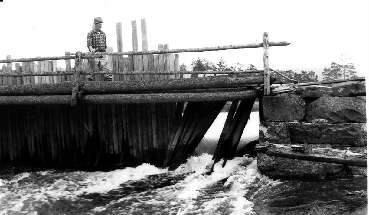 The current stone dam, built in 1893, consists of carefully hewn stones arranged as wedge-shaped blocks and features two openings. The Russvass dam is classified as a needle dam, where the main channel was closed off by vertical planks, typically sized at 2” x 4”. These planks were placed at the bottom of the dam against a horizontal bottom sill and at the top (in the dam crown) against a beam, also known as the needle support. During towing, the needles could be raised using the floating hook. The needles were often attached with a chain to the dam crown. When all the needles were raised, the timber could pass through the dam openings, where the needles hung loosely in the chains.