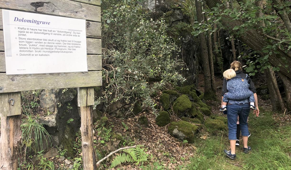 On the island you will find among other old ice dams, dolomite mines, garden soil and pasture landscapes, old thoroughfares, stone fences, golf course and picnic areas. Along the path there will be information boards about the place. Tablets discusses topics like old local place names, history, fauna and geology. Maps of the trail can be found hanging at ferry port at Tangane and at the Golf Club center at Kvernmyra. Follow the blue marks and cairns. Please close gates and pay attention to plants and animals!