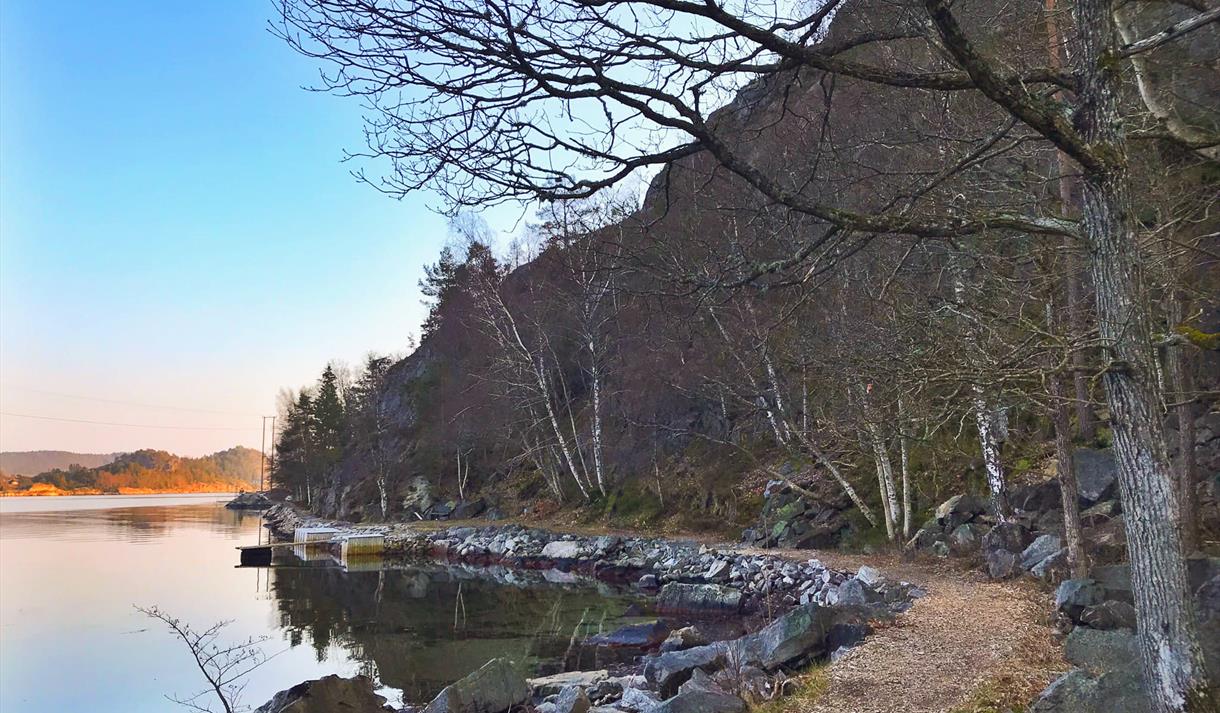 To get to the starting point, drive towards Helle and take a right right after the grocery store on to 'Fossingveien'. Keep going until you reach 'Soppekilveien' on your right hand side. Follow Soppekilveien for approx. 600 metres until you get to a small carpark. Park here and follow the marked path on the other side of the road. The path (Kyststien) is marked with blue.