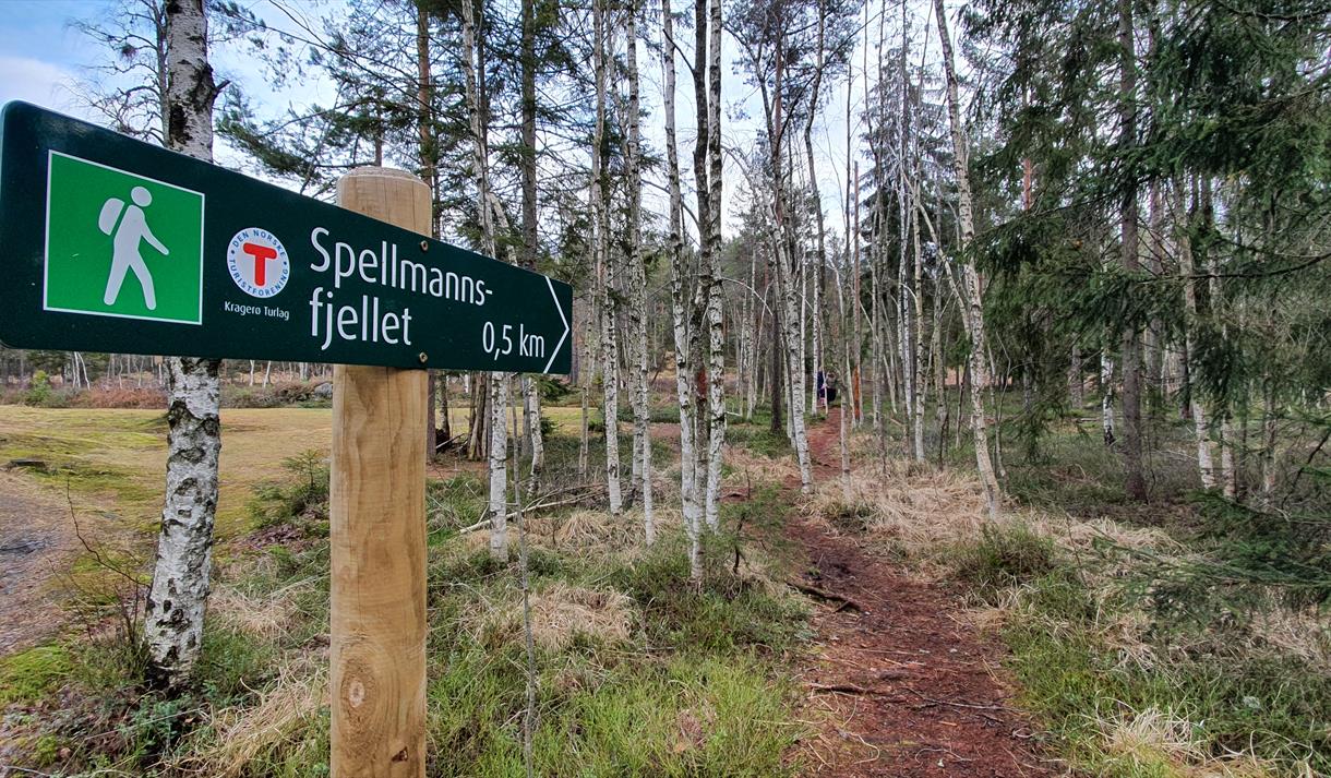 Drive to Sannidal and towards Kroken and 'Fikkjebakke' (Industrial area). Once you get to the industrial area FIkkjebakke on your right hand side, take the exit, then follow the road until you see a big map by a grit road to your right. At the start of the road there is a parking area. Park here if you want to walk the 3.5 kilomitres to the 'Tourist Cabin' (Turisthytta), before starting your trek to Spellmannsfjellet (approx. 25 min walk/1 kilometre from the Tourist Cabin.)