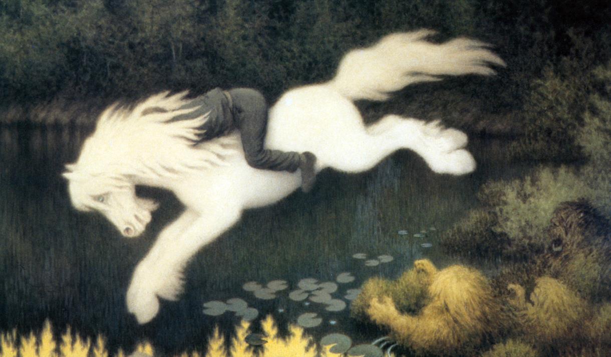 Nøkken is a mystical troll-like creature who according to Norwegian folklore lives in the lake. He has the ability to shapeshift, and often chooses to ascend from the lake as a beautiful white horse. When Nøkken takes on the shape of the horse, his aim is to lure innocent people up on his back so he can run back to the lake and bring them with him down to his kingdom at the bottom of the lake.