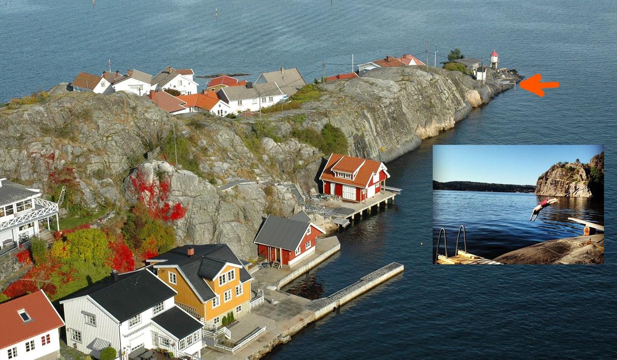 Take the bridge over to the island Øya and then turn left. Follow the road until it stops. Turn right around a cozy house and take the stairs up to Galeiodden. At the backside of the house you´ll find nice polished rocks. This is a public bathing spot even it looks like a private area!