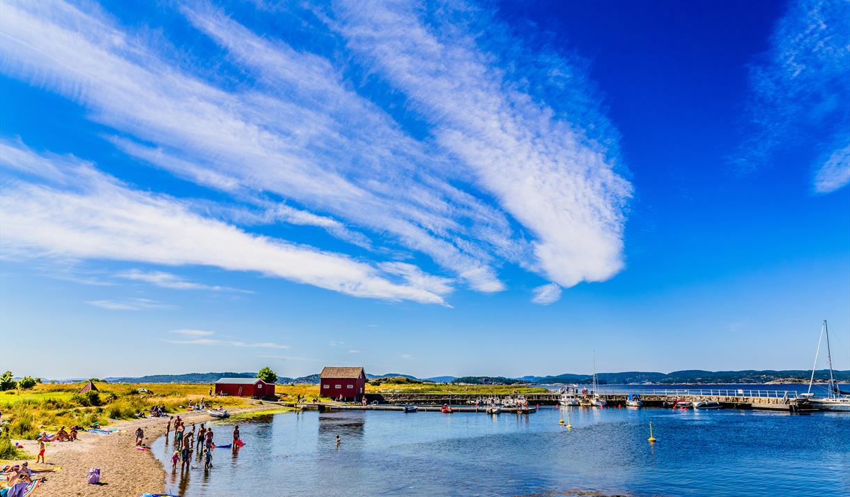 On the north side lies a sheltered dock and beach, frequently utilized as a recreation area for the local population and tourists. The dock is accessible by water taxi from nearby Kragerø, Valle (in Bamble) or Langesund, or by private vessel. The central settlement is reachable from the dock by a dirt path.