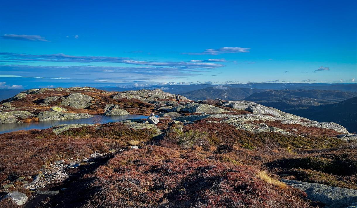 Halfway up the slope, you'll pass a small hollow and an area with quartz crystals. Once you reach the ridge, the terrain levels out, offering panoramic views of Gaustatoppen, Lifjell, and Notodden. At the northwestern end of the ridge stands a large cairn with a guestbook maintained by Notodden and Hjartdal Hiking Association.