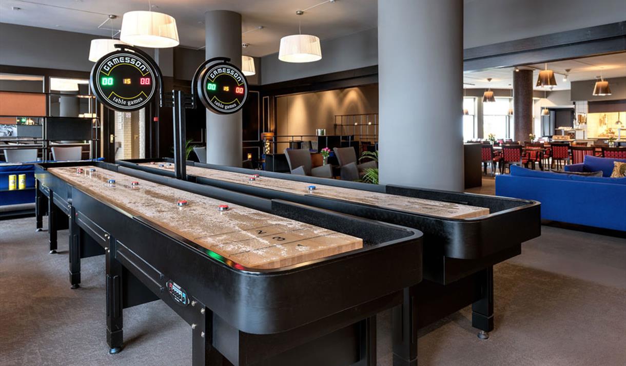 We also offer a welcoming lounge with a big screen and two shuffleboards that can be used during events.