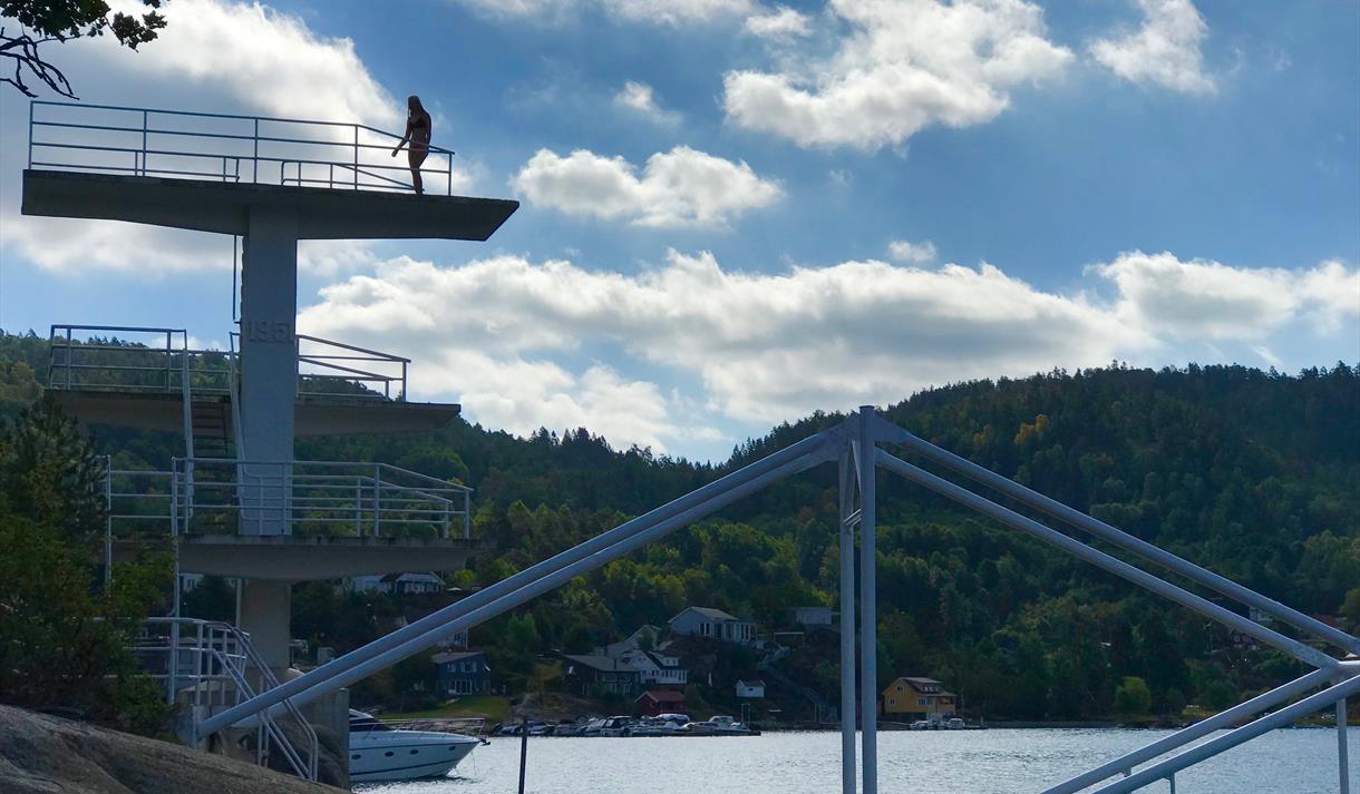 Welcome to the idyllic Olavsberget swimming area (Badeplass), a popular destination located by Olavsberget Camping and the beautiful Eidanger Fjord in Porsgrunn. This is the perfect sandy beach in Telemark for a day with family and friends, whether you prefer playing in the sand, diving from the tower, or sunbathing on the coastal rocks (svaberg).