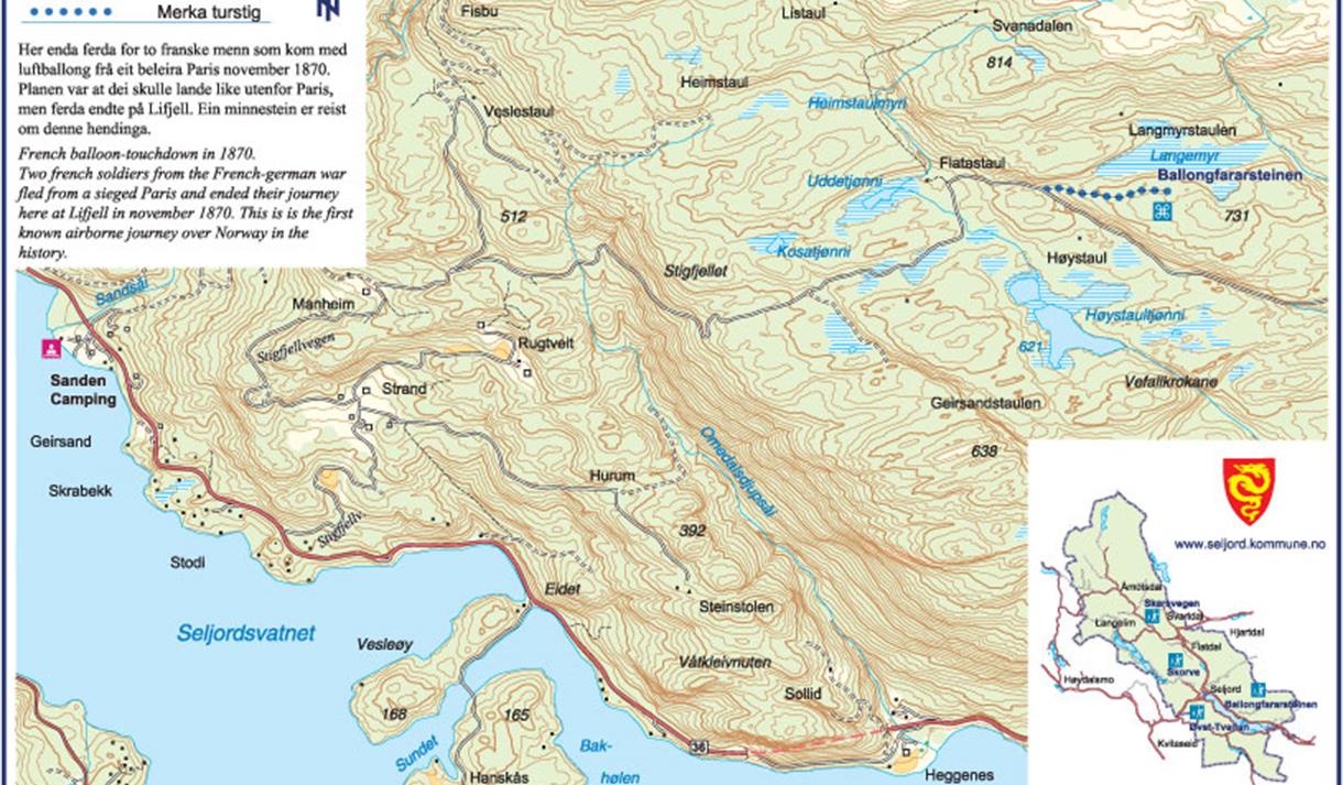 Ballongfararsteinen is set up on Lifjell in memory of two Frenchmen who came in the balloon from the besieged Paris all the way up to Lifjell in November 1870. A dramatic, long and cold journey from a war-threatened town, which ended at Lifjell above Strondegardane. Brothers Steve and Klas Beach localized the French men the morning after they had fallen down. The event became known throughout the country and the French were celebrated as heroes during the journey from Seljord to Christiania. Gunnar Sveinsson has made ​​a local historical game with balloon voyage as a theme and Einar Østvedt has written the book "The first air journey across Norway."