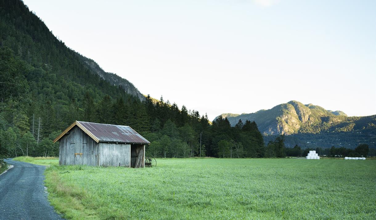 The walk to the Day Trip Cabin (Dagsturhytta) in Flatdal is a short and easy route across flat terrain, making it ideal for families, walkers, and cyclists alike. The trail follows a well-prepared gravel path across the Flatdal wetlands (Flatdalsøyan), with easy access from the parking area at Flatsjå. From the parking area, it takes only about 15–30 minutes to reach the cabin, but the surroundings invite you to spend a bit more time along the way.