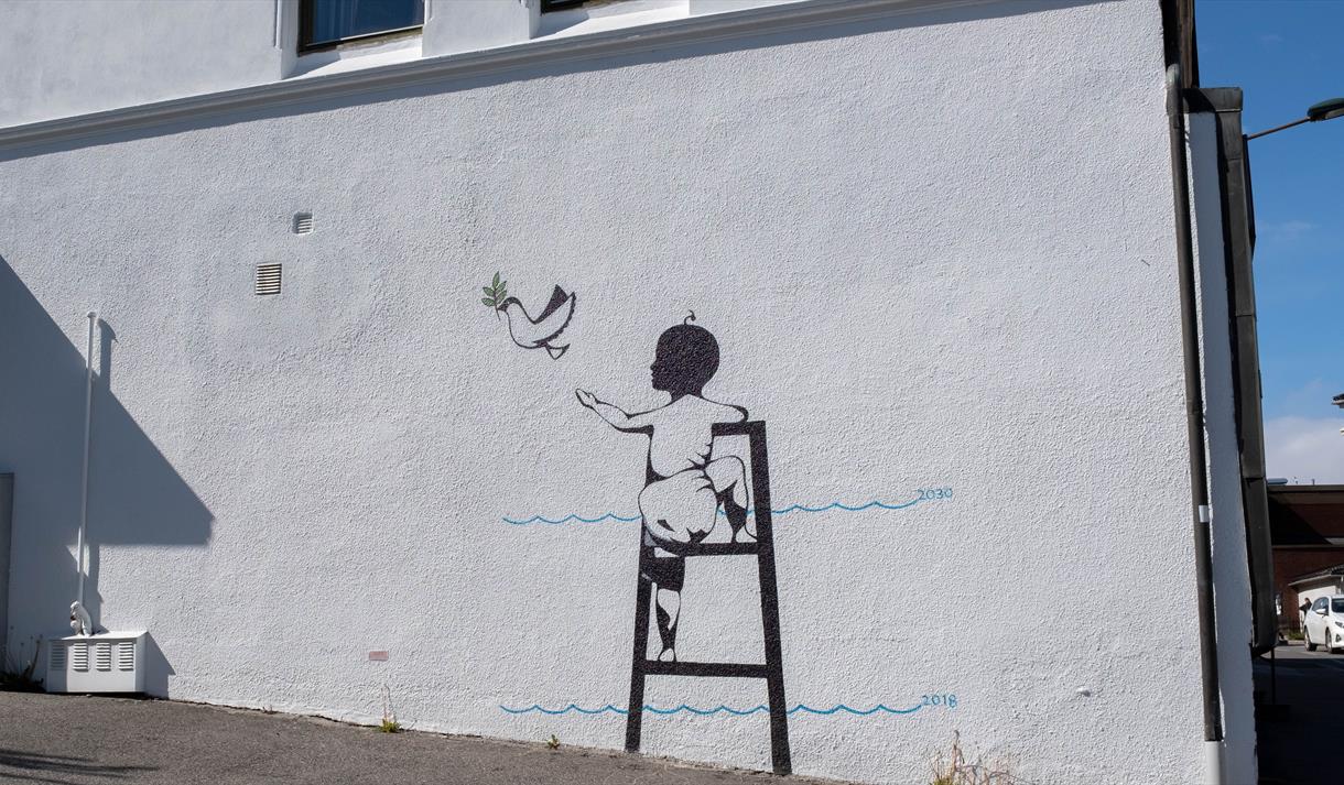 Painting: A simple design with message of safeguarding peace and our nature, and with an indication of possible water level in 2030. Victor Ash is a highly recognized French street artist, originally from Portugal , who lives in Copenhagen.