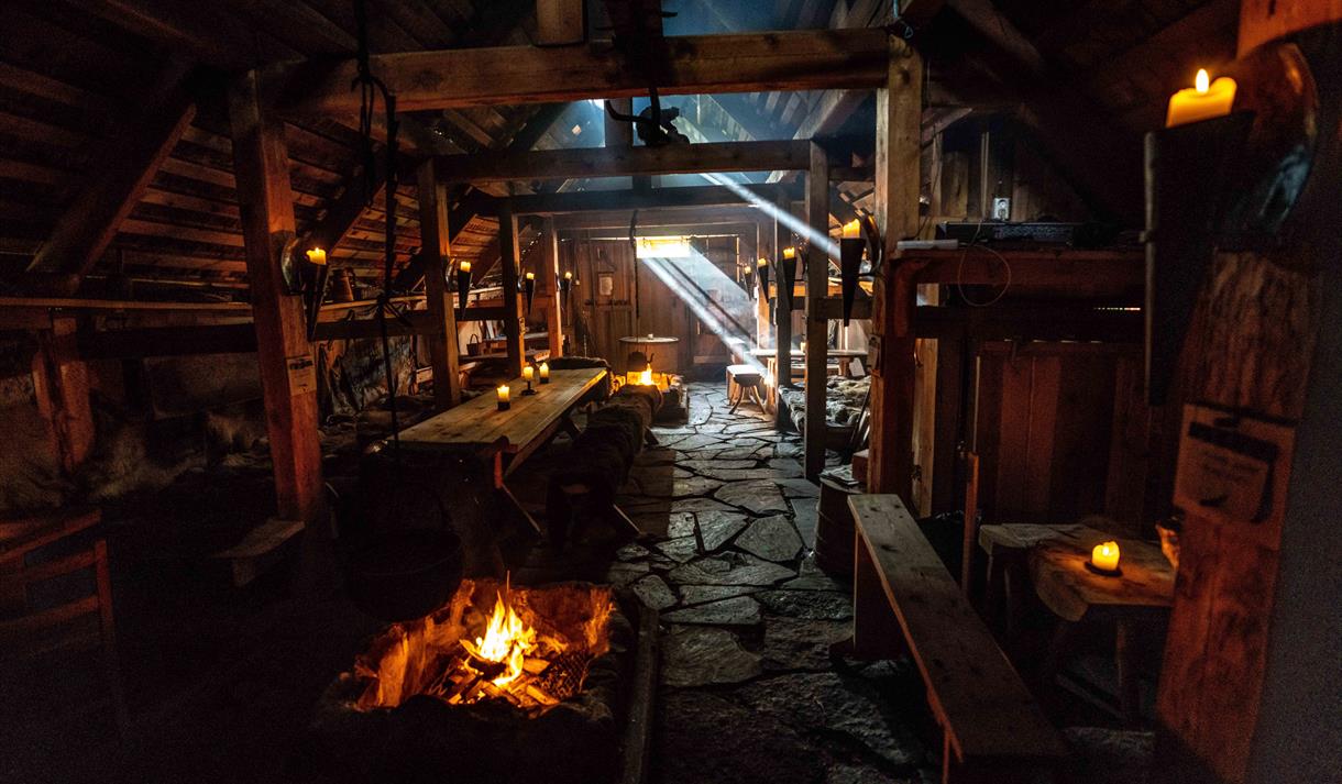 The main building, a three-aisled longhouse, was constructed using the ancient stave building principle with slightly curved exterior walls. The entire structure is held together with wooden pegs, without a single nail. Inside, you'll find two fireplaces and a raised seating area, or "high seat," where the great farmer once sat.