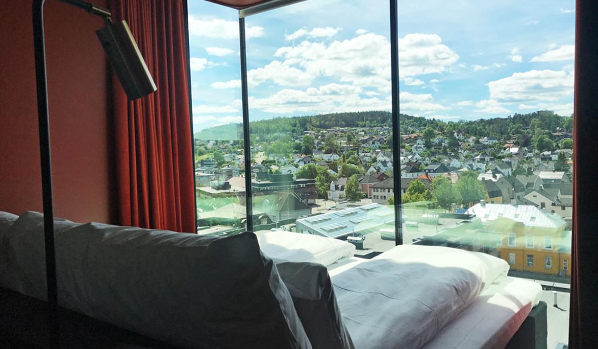 What an experience to train here! At the top of the hotel is the fitness room and here you can run on the mill and have a view all the way to the neighboring town of Skien in the north!