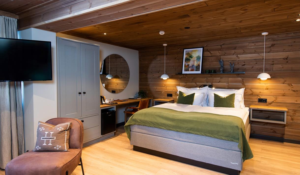 The hotel features 90 hotel rooms of various sizes, including allergy-friendly options, along with 43 traditional cabins and 12 practical apartments.