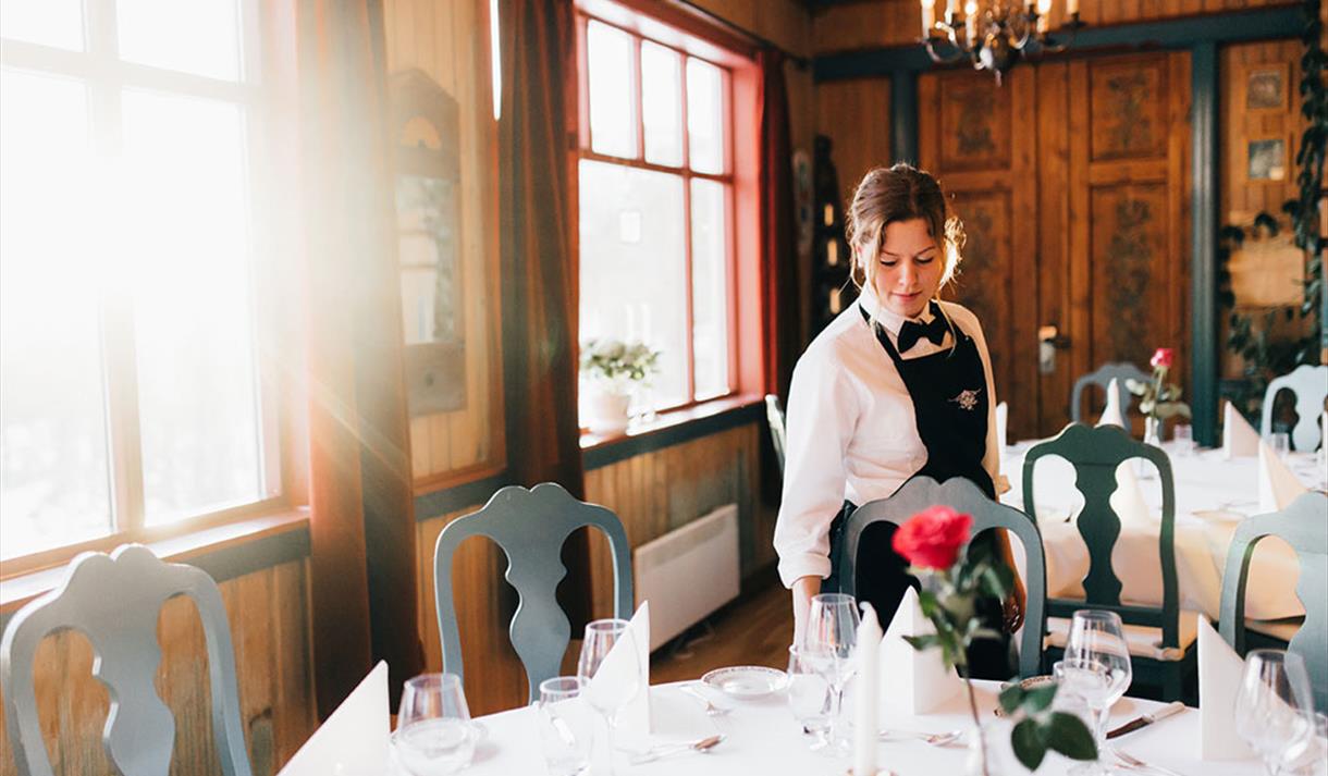 The old timber walls and white tablecloths, adorned with porcelain and silver, create a truly special atmosphere and setting for the meals. Often, the owner, Einar, is behind the pots himself, creating the most fantastic taste experiences. He has previously worked at several Michelin restaurants, and he and his wife, Malin, want the meal to be an experience and the highlight of your stay at the hotel.