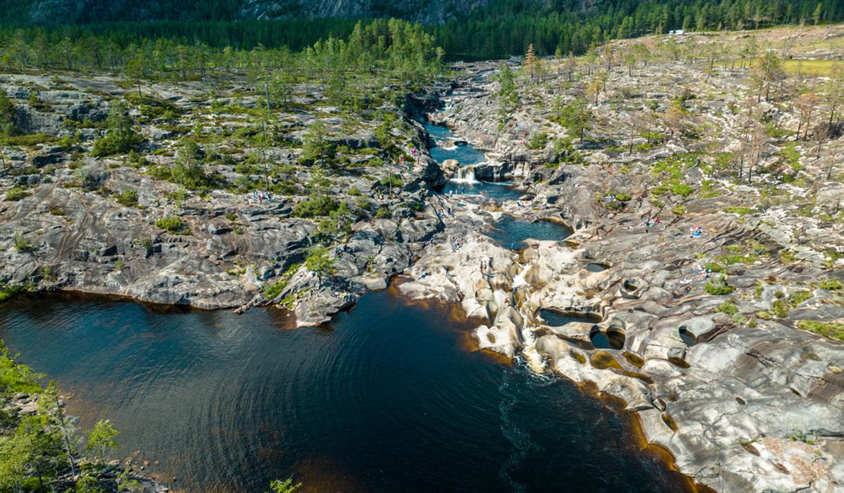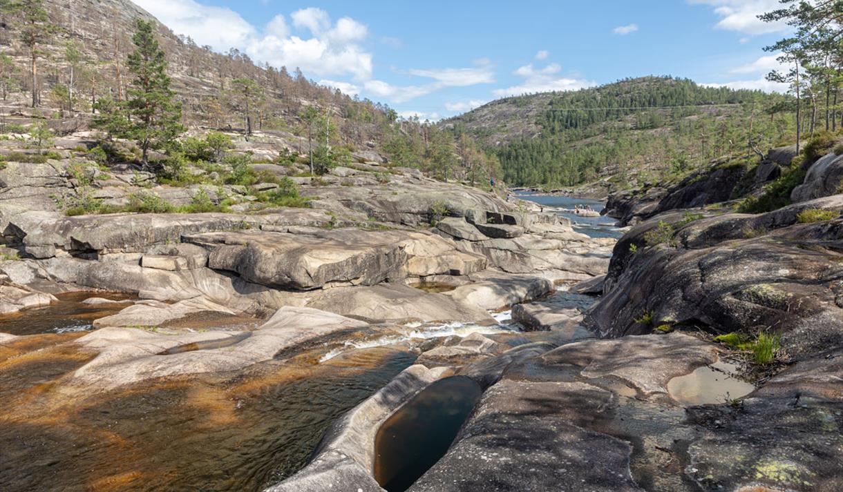 Along a stretch of approximately 300 meters, the potholes are densely packed – from small "footbaths" to deep pools and natural slides. The narrow valley and the warm rock slabs give you a genuine "Sørlandet" (Southern Norway) feeling. Jettegrytene has been a local favorite for generations and is today among Nissedal's most photographed natural phenomena, and has been named Telemark's finest swimming spot several times.