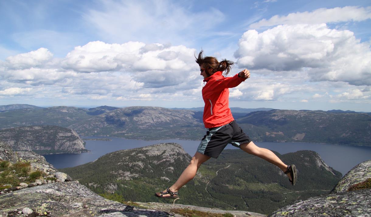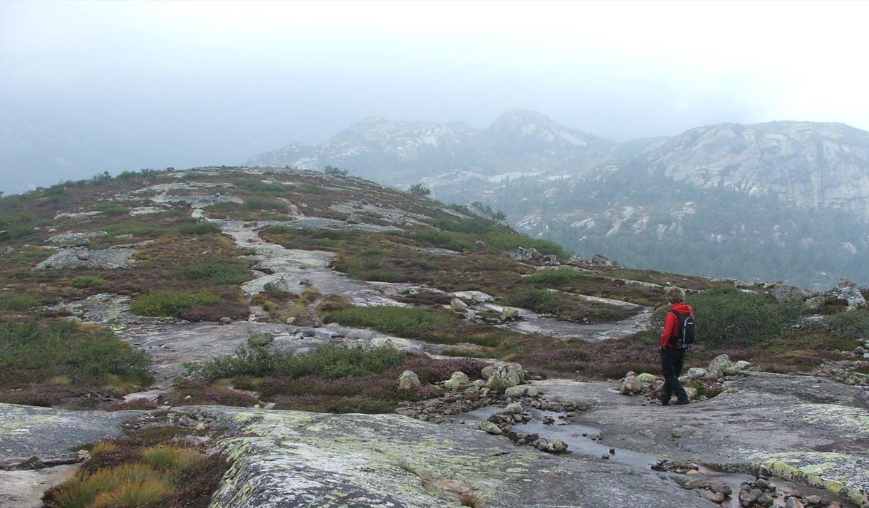 11 kmThe experience begins at the Fjone ferry on Route 41. The first part of the trek follows a dirt road, before entering a mystical forest where the trail quickly starts ascending as you near the mountain. Green, moss-clad undergrowth and ancient forest reminiscent of a fairytale wood with trolls and goblins. Once you have reached higher ground you will encounter the characteristic svaberg rocks that make the Nissedal mountains so unique. Although the route is steep, the walk to the beacon at the top of the mountain is easy. PS! Take binoculars with you and put them to use at the car park next to Landtaksdammen. Aim at the rock face and see if you can spot the climbers dangling from the precipice.