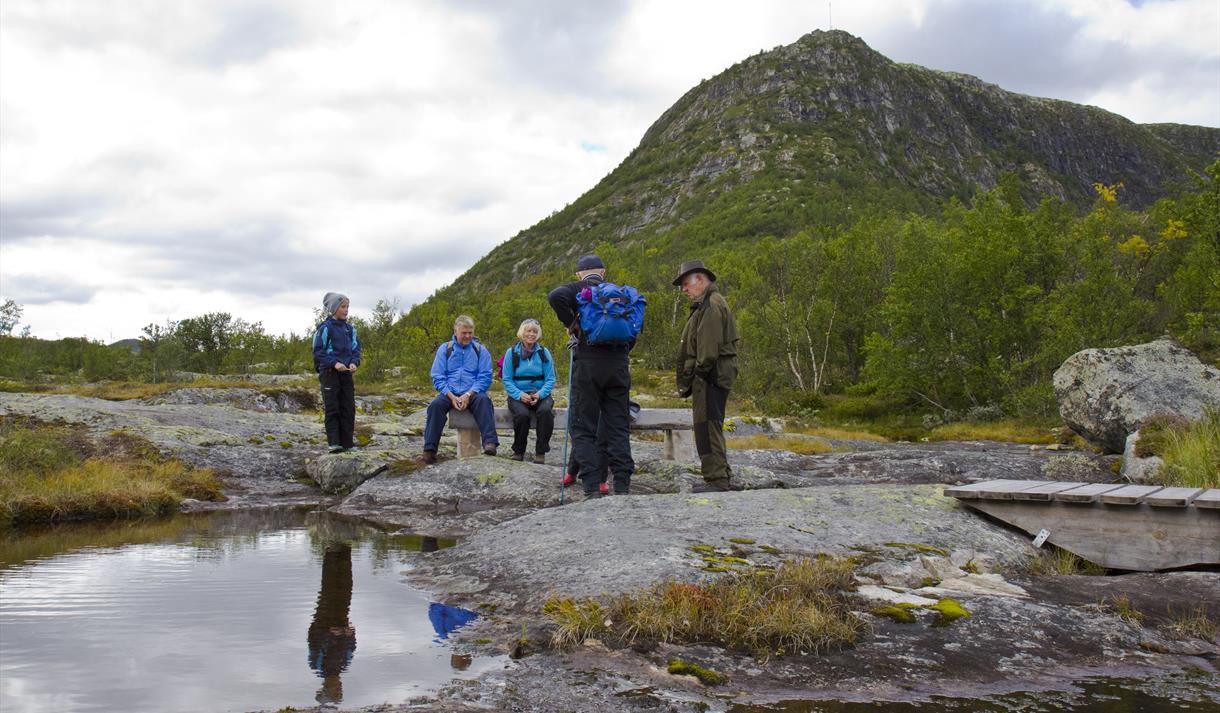 Start the trip at the Mogen Turisthytte (cabin) and follow the village road towards Argehovd. After the bridge at Hellegjuvbekken take a left along the dirt road that runs parallel to the stream. After about 100 m turn right and follow the path towards Kvenna. From there follow the rocks along the river before turning right and crossing the marsh using the plank road, ending up on the village road. Follow the village road back to Mogen.