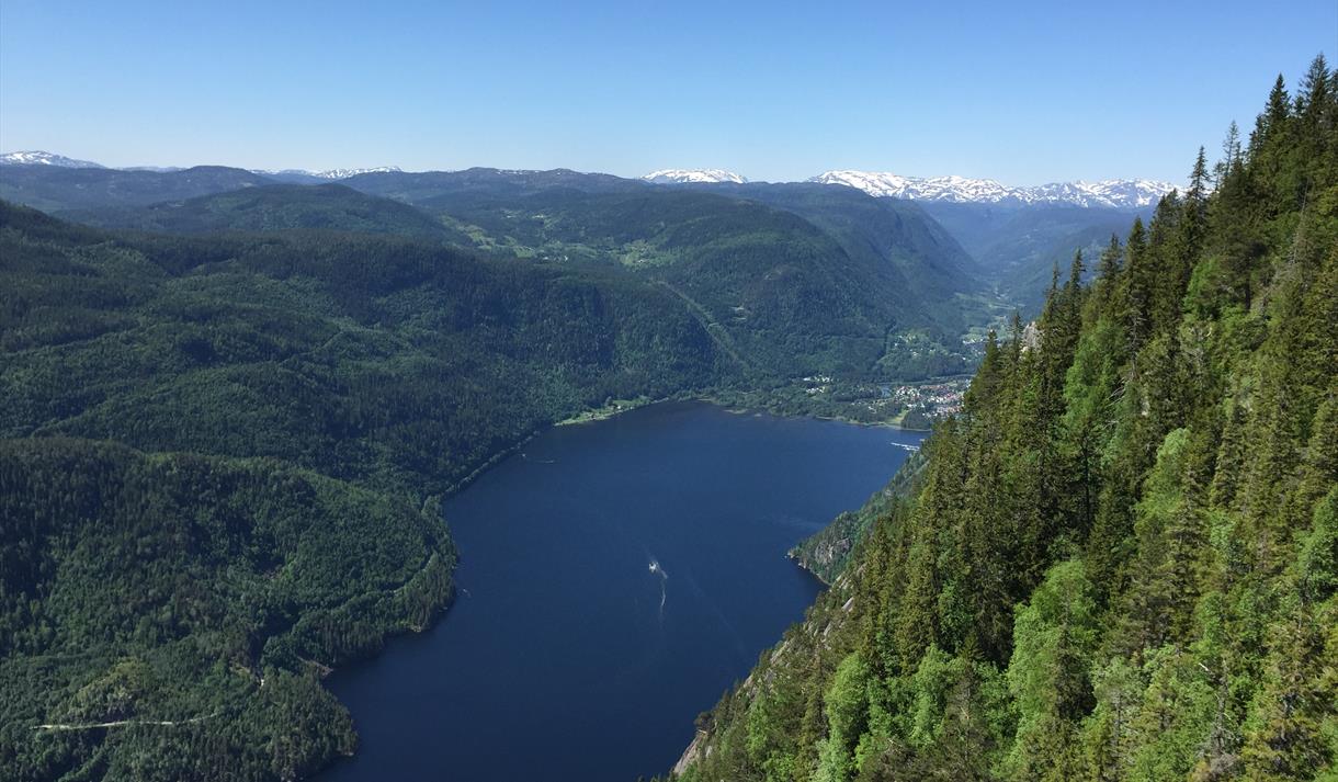 The inner part of the Telemark Canal is surrounded by steep and wild mountains. Along the mountain ridge from Dalen to Lårdal, there is a cleared hiking trail that offers many spectacular and exciting experiences. Much of the hike takes place on the mountain edge up to 800 meters above the Telemark Canal. Along this hike there is also a beautiful flora and the geology is very special. Here you can greet the rugged silhouttes of "Risen og Gygri", which stand in stone in front of the edge of the mountain, and read about the legend associated with these rock formations, or look at Bandak lake deep below you through the magnificent "Møyskrivet".